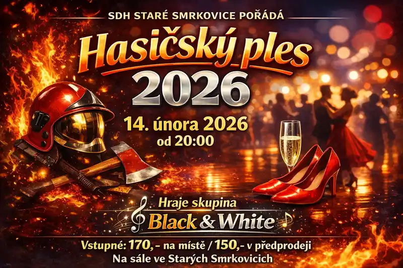 Obec Staré Smrkovice srdečně zve všechny na tradiční Hasičský ples, který se koná 14. února 2026 od 20:00. Přijďte si užít večer plný tance, zábavy a dobré nálady. O skvělou atmosféru se postará kapela Black & White, která zajistí plný parket. Budete mít příležitost setkat se s přáteli a prožít nezapomenutelný večer v příjemném prostředí. Těšíme se na vaši účast!