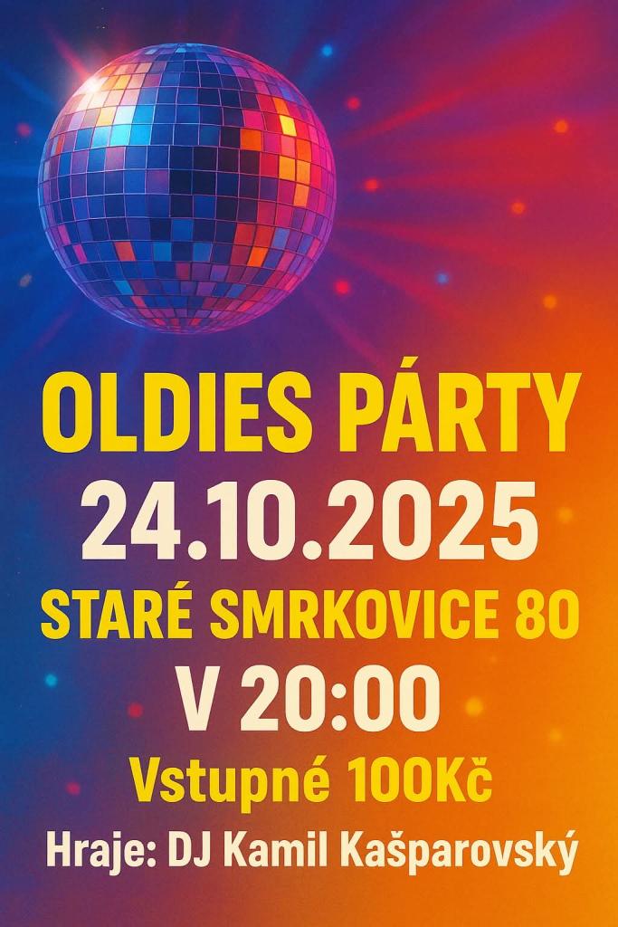Zveme vás na Oldies párty, která se uskuteční 24. října 2025 od 20:00 v Starých Smrkovicích. Těšit se můžete na skvělou atmosféru a hudbu, kterou bude hrát DJ Kamil Kašparovský. Přijďte si užít večer plný nostalgických hitů a příjemné společnosti. Vstupné činí 100 Kč.
